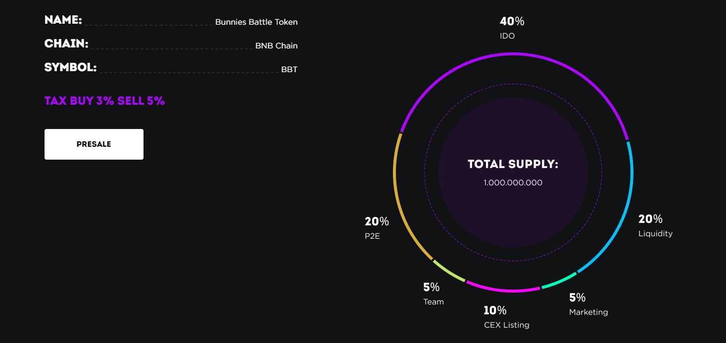 Bunnies Battle Token: Is a well-regulated token with a total supply limited to 1 billion tokens. Its abbreviation is $BBT, it can be used for operations in the ecosystem, game rewards, purchase of NFTs.